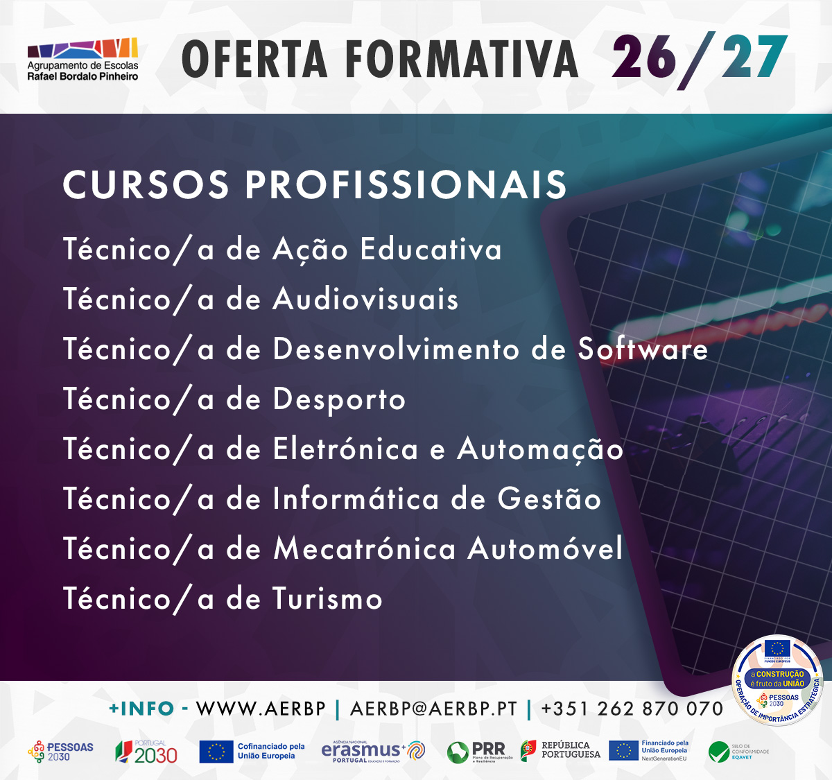 A escola oferece também Cursos Tecnológicos Especializados nas áreas Industrial e Informática, com uma forte componente prática e formação em contexto real, que abrem portas para o Ensino Superior e para um mercado de trabalho dinâmico e cheio de oportunidades.