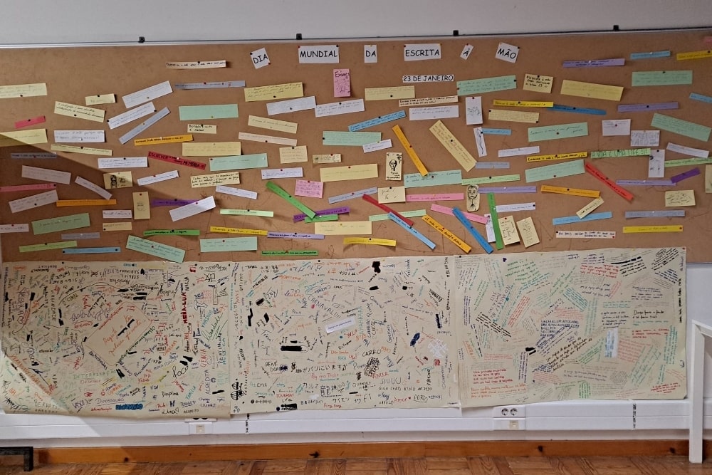 No âmbito da comemoração do Dia Mundial da Escrita à Mão, foram realizadas diversas tarefas, tais como: registo da palavra favorita de cada aluno, elaboração de pequenos poemas, experiência de escrever/desenhar com aparos e tinta da china, elaboração de um mural com mensagens…