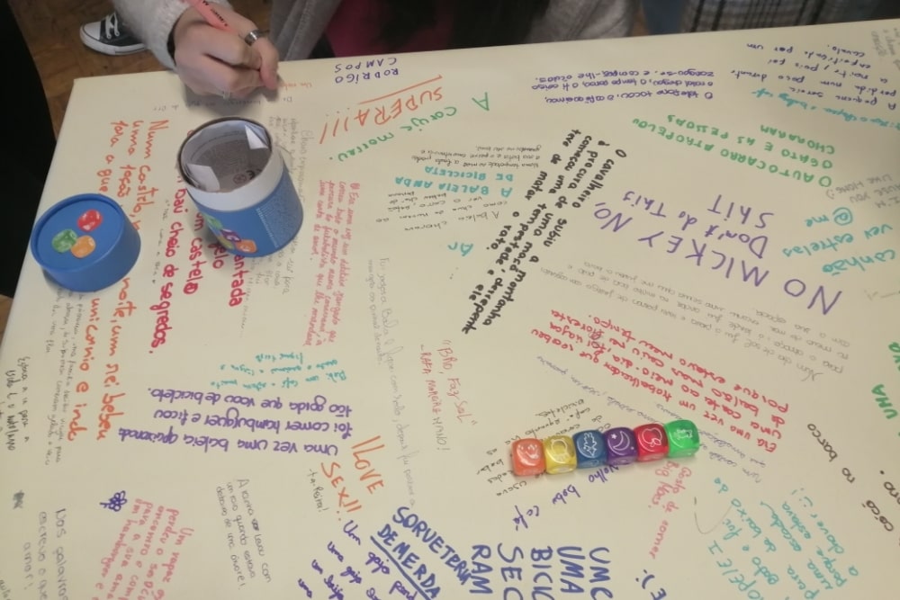 Esta atividade foi desenvolvida na Escola Secundária Rafael Bordalo Pinheiro e na Escola Básica de Santa Catarina pelos professores de Português e pela artista residente Amábile Benzinelli.
